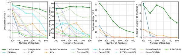 * 在广泛的基准实验中,La-Proteina 在无条件蛋白质生成方面达到了 SOTA 性能,能够生成多达 800 个残基的多样化、可共同设计且结构有效的完全原子级蛋白质。