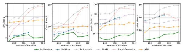 La-Proteina 比现有的全原子生成 baseline具有更高的结构有效性