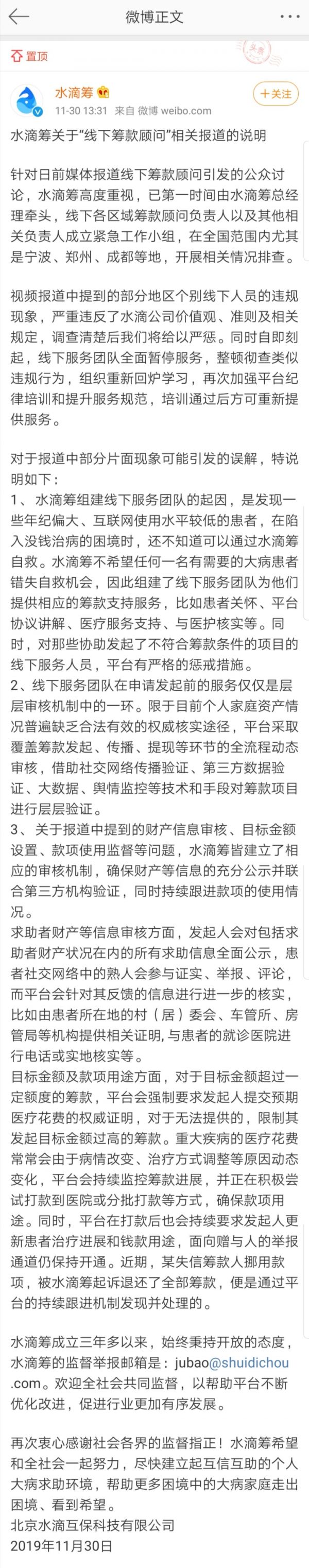 对于这一报道,11月30日,水滴筹在官方微博上发布了关于“线下筹款顾问”相关报道的说明,回应称,视频报道中提到的部分地区个别线下人员的违规现象,严重违反了水滴公司价值观、准则及相关规定,调查清楚后我们将给以严惩。同时自即刻起,线下服务团队全面暂停服务,整顿彻查类似违规行为,组织重新回炉学习,再次加强平台纪律培训和提升服务规范,培训通过后方可重新提供服务。