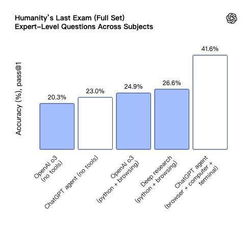 在技术的天花板还够高的情况下,后来者正在拔高Agent的能力标准。今日(7月18日),OpenAI发布的通用Agent产品ChatGPT Agent跑出了一个漂亮的效果,在HLE 测试表现上,取得了41.6%的新SOTA 成绩。