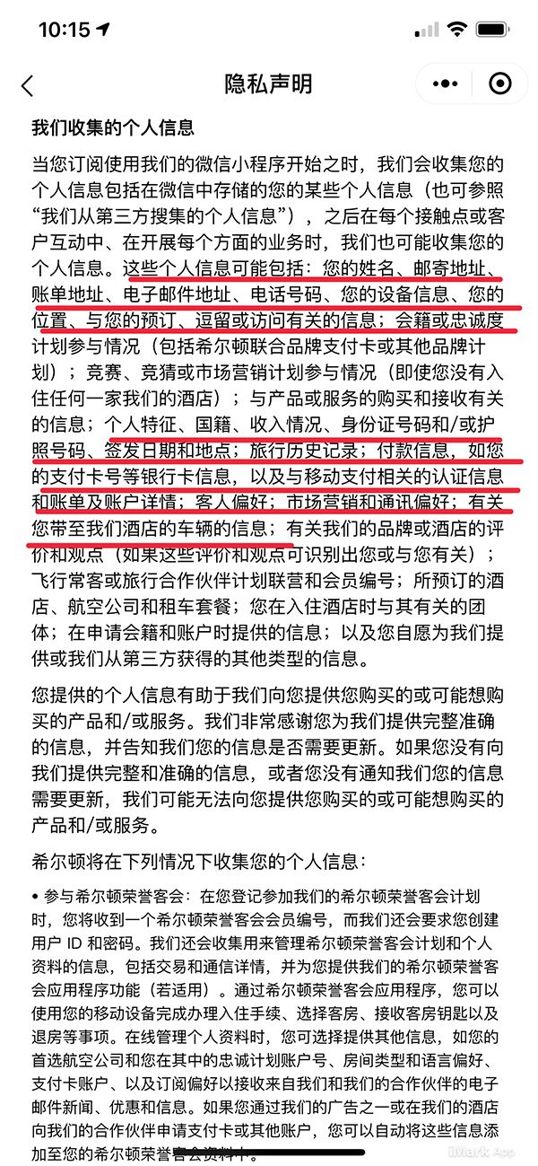 隐私声明明确,收集的个人信息除了包括姓名、邮寄地址、账单地址、电邮地址、电话号码、位置等,还会收集包括个人特征、收入情况、身份证号码或护照号码、付款信息如支付卡号等银行卡信息。而在“从第三方收集的个人信息”条款中,则明确,订阅微信小程序后,会从微信收集个人信息,否则,可能无法提供微信小程序(服务)。此外,个人敏感信息也可能被收集。