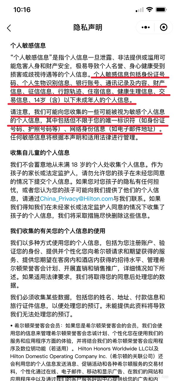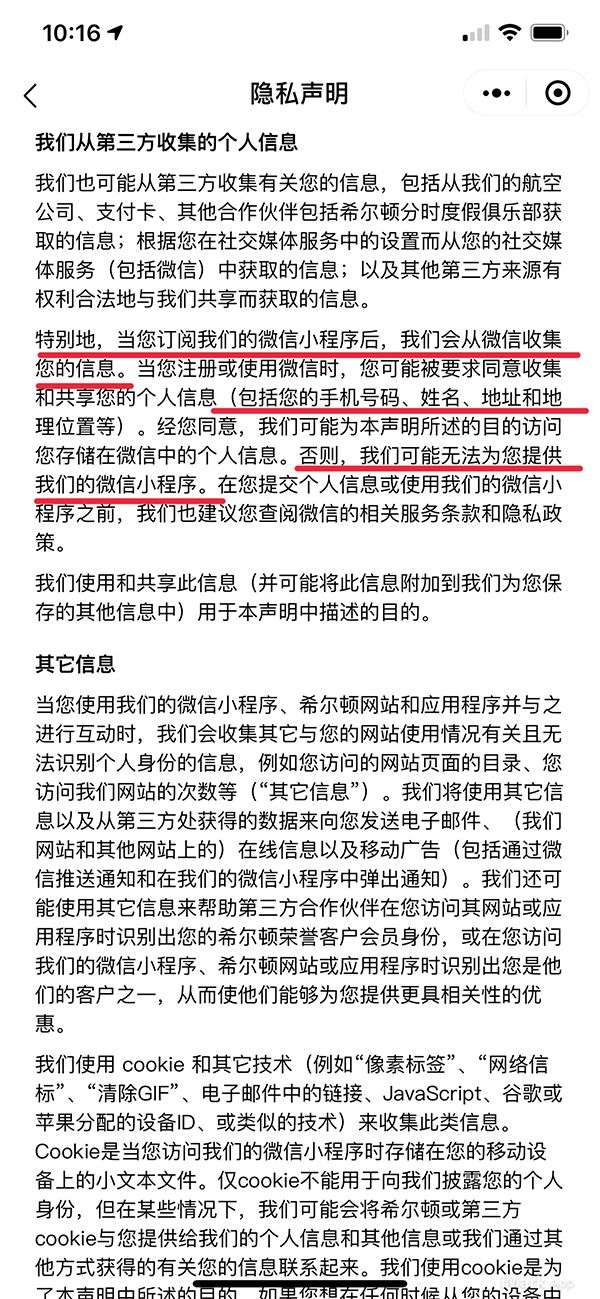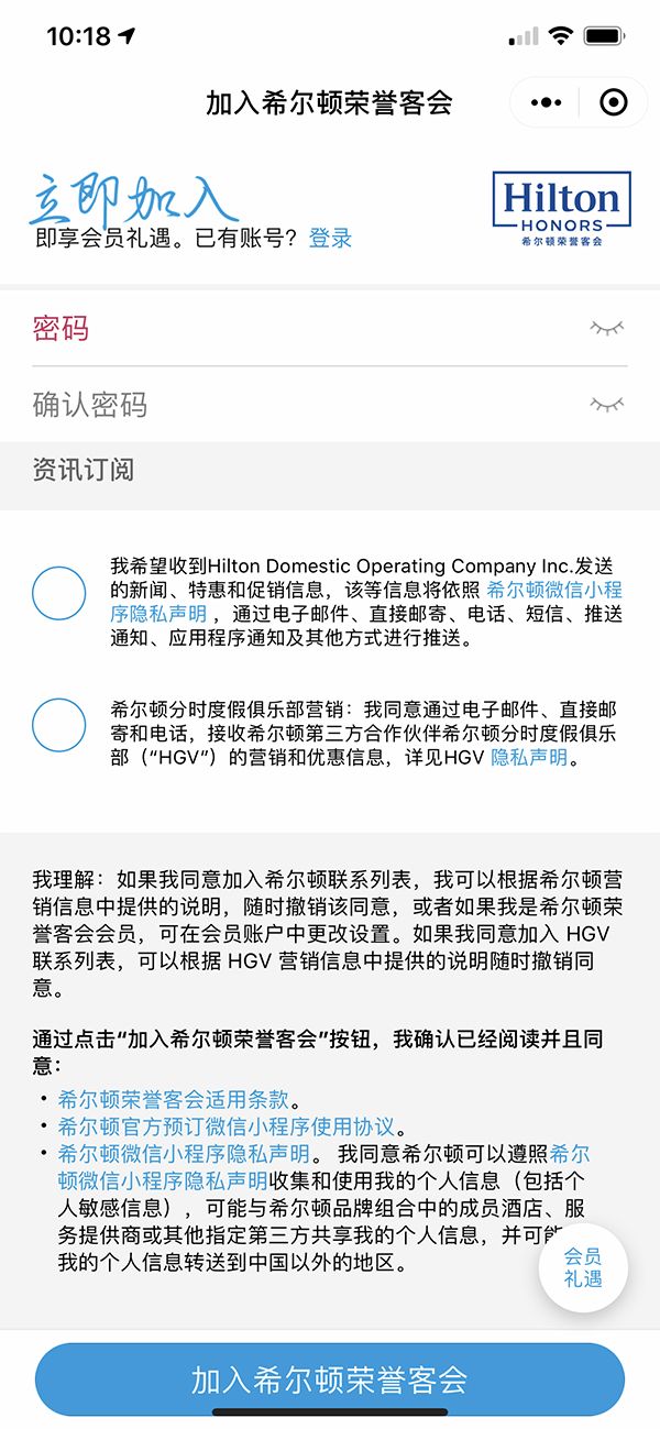 澎湃新闻在使用微信预定酒店时则发现,以希尔顿酒店预订的小程序为例,预定酒店首先需加入希尔顿会员,在注册会员页面的最后,点击加入的按钮即视为确认已经阅读并且同意相关的使用协议和隐私声明。