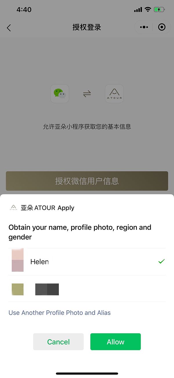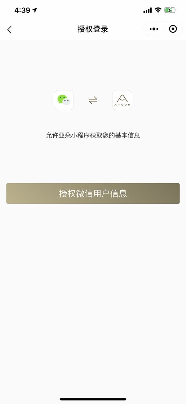 而在亚朵的酒店预订小程序中,若要预订酒店,首先需要登录,而登录方式仅有一种,即授权微信用户信息,不然无法继续。而不论在授权界面还是统一授权信息的界面,甚至没有相关的服务条款和隐私声明。