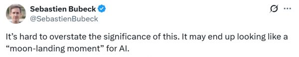 OpenAI科学家Sebastined Bubeck称之为AI的“登月时刻”。简单讲:一个只是预测下一个词的机器(真的是啥工具都没用)刚刚给出了几个又难又新的数学题的创造性证明,这种水平平时也只有少数天才少年能做到。
