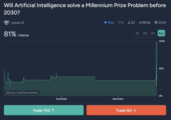 人工智能会在2030年前解决一个千禧年大奖难题吗?当前市场上对这个问题的预测概率骤然上升,达到了81%。