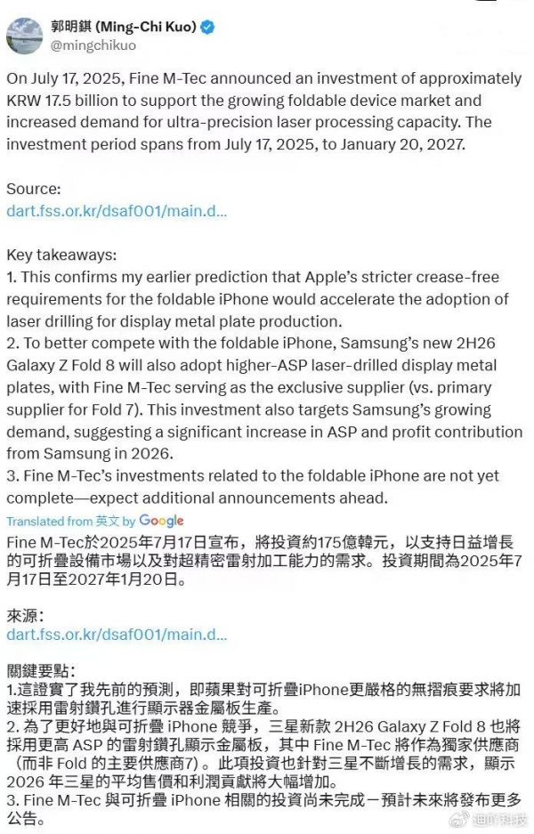 根据供应链信息,Fine M-Tec将供应苹果折叠屏手机超过80%的金属板需求,同时还是Galaxy Z Fold 8的独家供应商。