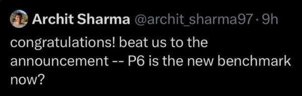 谷歌DeepMind研究员Archit Sharma调侃道,“恭喜!居然比我们先官宣了——现在P6是新标杆了吗”?