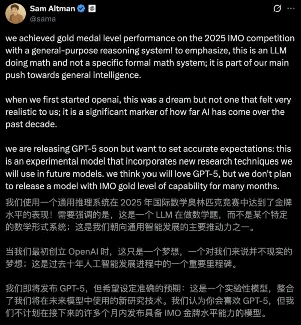 OpenAI“截胡”IMO金牌,奥特曼为GPT-5献上“核弹级”预热
