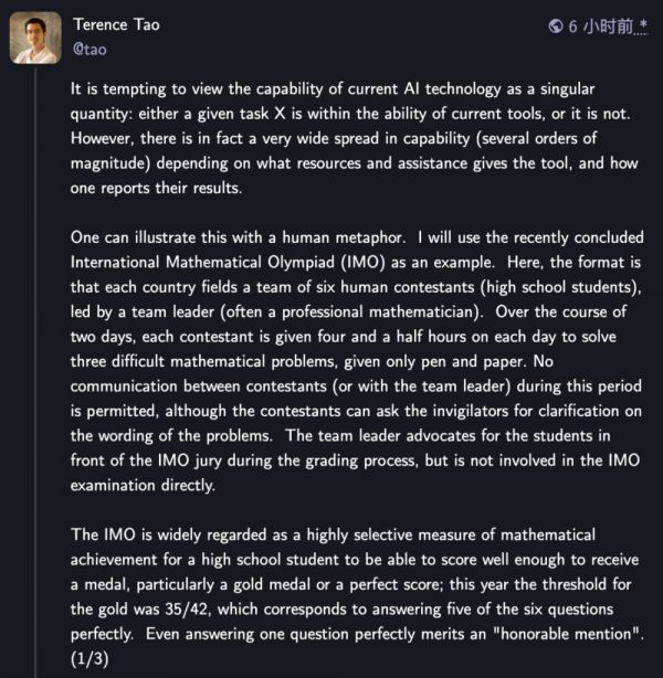 针对IMO金牌得主背后的争议,数学大佬陶哲轩也公开表达了自己的看法。