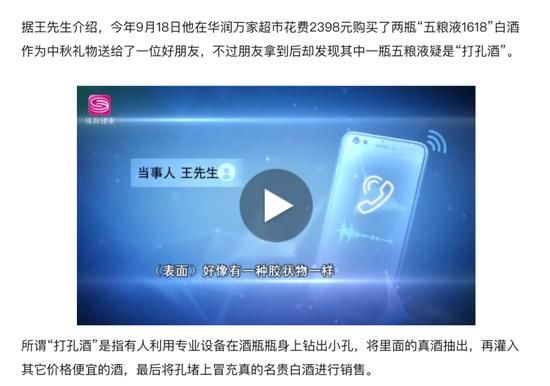 2021年,有媒体报道,有消费者在华润万家超市买了两瓶五粮液白酒,消费者质疑其中有一瓶白酒为“打孔酒”。