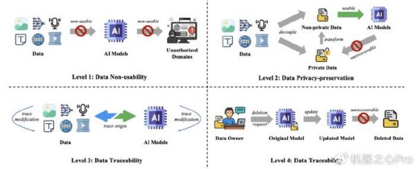 等级 1. 数据不可用(Data Non-usability):数据不可用指的是从根本上阻止数据被用于 AI 模型的训练或者推理流程,即使攻击者获取了数据,这些数据也不会对模型的学习或者预测起到任何正面作用。数据不可用是最高级别的数据保护,通过牺牲数据效用来换取绝对的保护。等级 2. 数据隐私保护(Data Privacy-preservation):数据隐私保护旨在保护数据中的隐私部分,避免个人的隐私信息(如年龄、性别、地址等)在收集和模型推理的过程中被泄露。相比于等级 1,数据隐私保护保持了一定程度的数据可用性,但仍然是很强的数据保护层级。等级 3. 数据可溯源(Data Traceability):数据可溯源指的是当数据被用于 AI 模型开发和应用时,能提供追溯数据来源、数据使用记录和数据修改的能力,这种能力使得监管者或数据所有者能够审计 AI 应用中数据的使用,从而避免数据被不当使用。实现数据可溯源通常只需要对数据进行微小的修改甚至不修改,因此能够很好地保持数据的可用性。等级 4. 数据可删除(Data Deletability):数据可删除指的是在 AI 应用中完全删除一个数据或其影响的能力,这也是许多数据保护法律法规(如欧盟 GDPR)中规定的「可遗忘权」。数据可删除使得开发者可以在数据不被需要或者被撤回许可的场景下以较低的开销消除影响,数据可删除为 AI 应用开发者提供了完整的数据可用性,但仅在数据使用的阶段提供了较弱的数据保护。