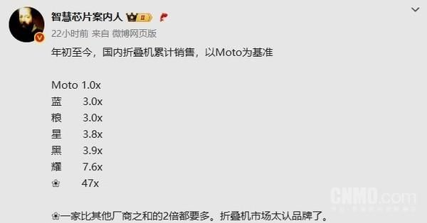 【CNMO科技消息】近日,有数码博主曝光了2025年初至今国内折叠屏手机的累计销量数据。CNMO注意到,华为以绝对优势领跑市场,真正实现了“一个打十个”。根据爆料信息,以摩托罗拉(moto)销量为基准“1.0×”,华为销量高达47×,远超其他品牌总和。具体表现为:vivo和小米各为3.0×,三星3.8×,OPPO 3.9×,荣耀7.6×,而其他六家品牌合计仅22.3×,不到华为的一半。博主感叹,折叠屏市场高度依赖品牌影响力,华为已形成“一超多弱”的垄断格局。