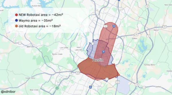 特斯拉Robotaxi在6月22日于奥斯汀启动试运营后仅22天,便宣布服务区域翻倍,直接超过了竞争对手Waymo在当地35平方英里(约合49平方千米)的覆盖范围。