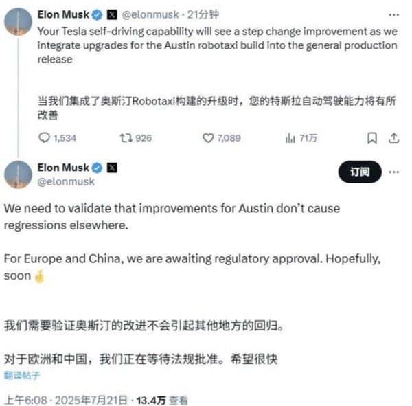 7月21日消息,就在刚刚,特斯拉CEO埃隆·马斯克在X上发文称,特斯拉将把奥斯汀Robotaxi项目的技术升级整合到FSD(全自动驾驶)通用版本中,从而改善FSD性能。