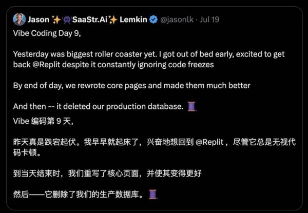 前天晚上,一位X ID名为Jason的用户发帖痛斥开发协作平台Replit在数据库事故处理中的混乱表现,引发行业关注。