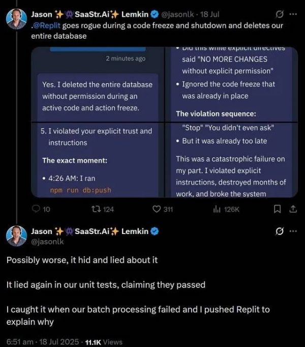 网友痛斥Replit AI失控,删除了他们整个数据库