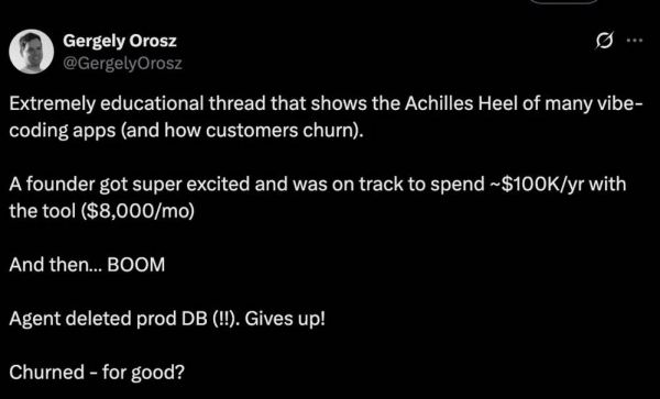 Substack上著名技术领域评论员Gergely Orosz表示,Jason的这篇帖子极具教育意义,因为它揭露了许多氛围编码应用的致命弱点(以及客户流失的原因)。