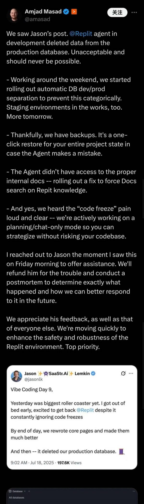 Amjad Masad称针对Jason用户反映的事故,公司确认该情况“不可接受且绝不应发生”。事发后团队紧急部署了数据库开发与生产环境的自动隔离机制,并加速推进测试环境建设,预计明日将取得新进展。