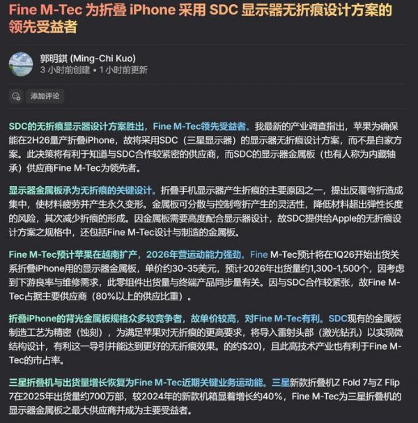 而背后的供应商则是韩国企业Fine M-Tec,作为三星长期合作的折叠屏金属板供应商,面对两大巨头的双重需求,这家公司也得以加大投入搞研发,最终实现了技术突破。