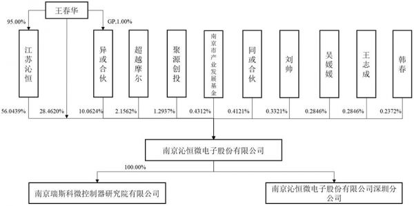 IPO前,沁恒微董事长兼总经理王春华直接或间接持有沁恒微95%股权。具体来看,王春华直接持有28.46%股份,通过江苏沁恒、异或合伙分别控制公司 56.04%、10.06%的股份,合计控制94.57%股份,系公司的实际控制人。