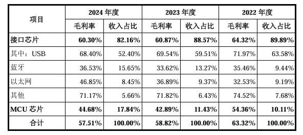 2024年,沁恒微主营产品的产量为3.28亿颗,销量为2.92亿颗,产销率为88.85%。然而,沁恒微主营业务毛利率却逐年下滑,2022年至2024年分别为63.32%、58.82%、57.51%。对此,沁恒微在招股书中表示,该公司蓝牙、以太网及MCU芯片增长率均高于毛利率相对较高的USB芯片,拉低了主营业务毛利率。