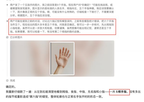 综上,我们说模型并不具备视觉能力是对的,但要说模型不能识别6指这种简单任务是不对的,只是对应业务需要完成这个模块,需要自己填充训练数据罢了。