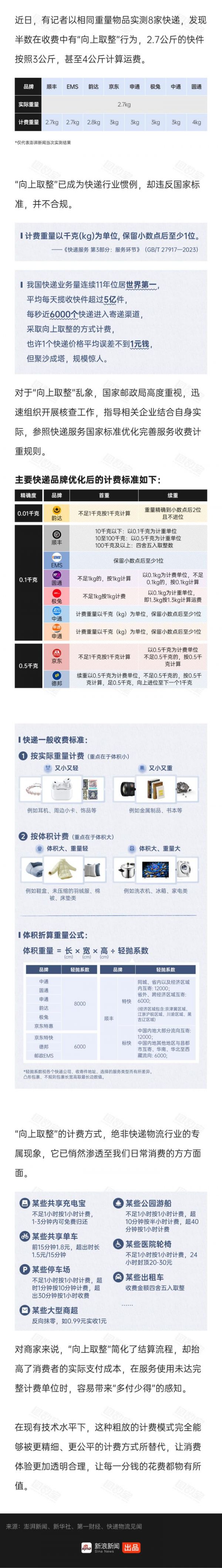 我国快递日均业务量超5亿件、每秒近6000件,微小单件误差经海量放大,对消费者权益侵蚀不容小觑。日前,国家邮政局已介入,推动主要品牌提升计费精度,哪家快递优化后的计费标准最精确?
