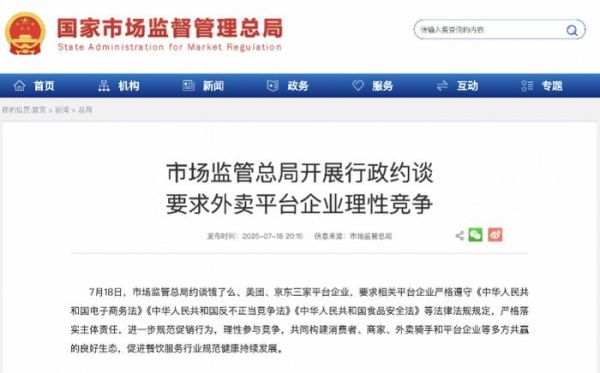 7月18日,市场监管总局重磅出击,集体约谈饿了么、美团、京东三大外卖平台。
