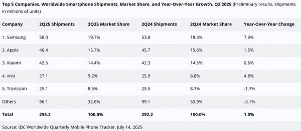 放眼全球手机市场,三星可谓是苹果的头号竞争对手。根据IDC调查报告,2025年Q2全球手机总出货量为2.952亿部,同比增长了1%,其中三星出货量为58亿部,位列出货量榜单首位,随后的排名依次为苹果(46.4亿部)、小米(42.5亿部)、vivo(27.1亿部)以及传音(25.1亿部)。