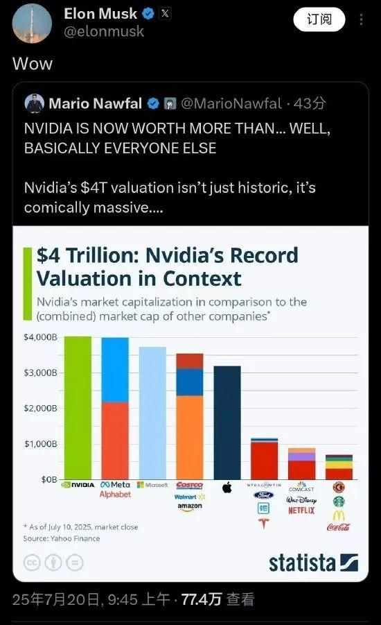 7月20日,亿万富翁埃隆·马斯克转发了一条英伟达市值突破4万亿美元的帖子,并发出感叹:Wow。