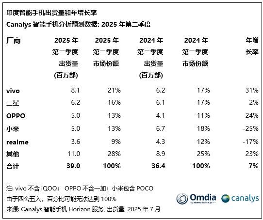 7月22日,市场调研机构Canalys发布的最新数据显示,2025年第二季度,印度智能手机出货量止跌,同比增长7%,达到3900万部。