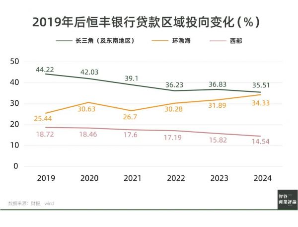 自此,恒丰银行在贷款投向上发生了显著变化。一方面是区域投向上,长三角地区占比和西部地区均呈现下降态势,环渤海地区占比上升。