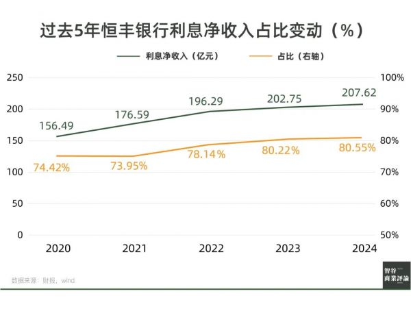但下行压力并不低。从近几年来看,恒丰银行的利息净收入增速正在显著放缓。表现在营收占比上,2024年同比仅增长了0.33%,堪称原地踏步。