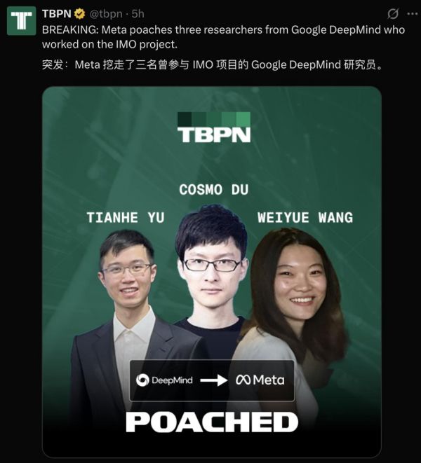 这不,昨天Google 刚拿下 AI 奥数金牌(IMO)官方认证,疯狂打脸 OpenAI ,还没高兴一天就被「偷家」, IMO 背后三个核心研究员被 Meta 挖走,又双叒叕是华人。