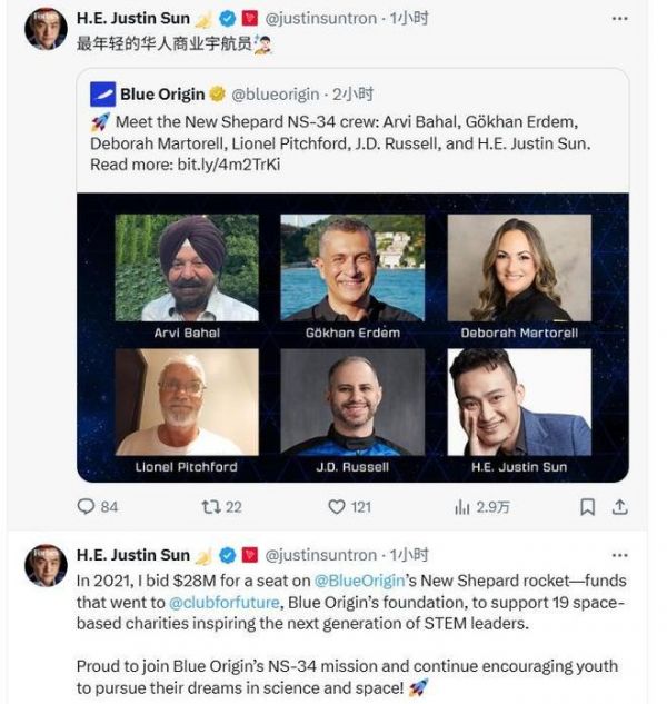 蓝色起源特别指出,孙宇晨通过2021年2800万美元的竞标赢得了新谢泼德号的首个座位。在竞得太空宇航员座位四年后,孙宇晨即将真正“升空”,币圈评论认为,这一事件标志着加密货币领域财富与商业航天探索的深度融合。