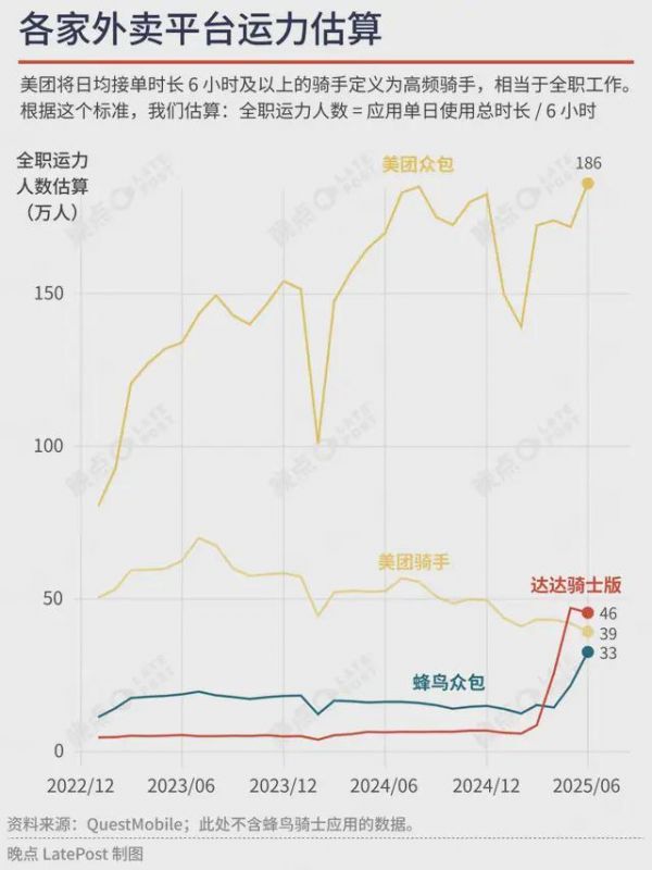 我们参照美团标准,根据各家骑手应用在线时间数据测算了运力 —— 用总时长除以 6 小时,计算出当天的运力。今年 6 月,美团平均每天的运力相当于 225 万人全职工作,同期美团日订单量在 9000 万单规模。