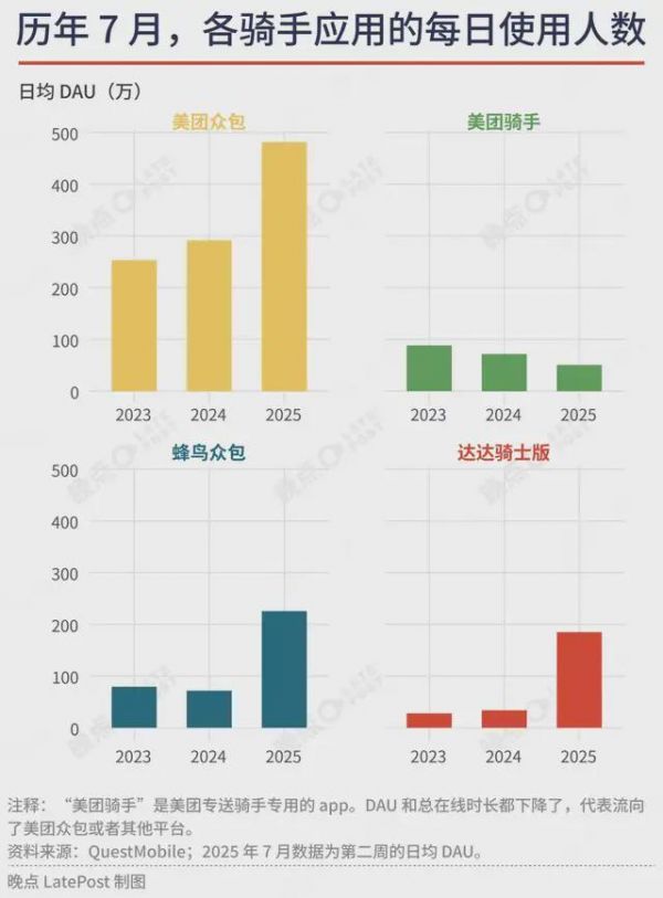 自 4 月底推出淘宝闪购联手饿了么迎战美团、京东以来,淘宝闪购新增的单量主要通过蜂鸟众包的骑手配送完成。根据 QuestMoblile 向我们提供的数据,7 月第二周,蜂鸟众包 App 的日活用户为 225.6 万人,是 4 月和去年同期的三倍多,蜂鸟专送骑手的日活也从 4 月的 23.7 万增长至 35.4 万。