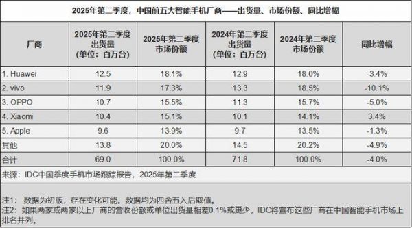 IDC数据显示,2025年第二季度,中国智能手机市场出货量结束了连续六个季度同比增长,出货量6896万部,同比下降4.0%。整个上半年,中国智能手机市场出货1.4亿台,同比下降0.6%,与去年同期基本持平。