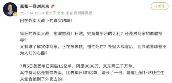 前段时间,嘉和一品创始人兼董事长刘京京,更在社交媒体发文控诉外卖大战裹挟商家。她表示如果顾客使用了一个10元红包,平台只出3元,商家要补7元,大头都是商家出的,所谓的外卖大战其实是对餐饮商家的掠夺。
