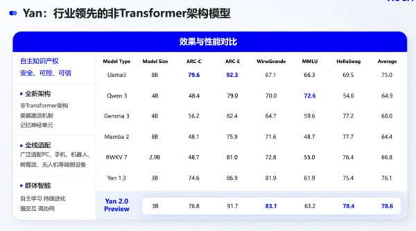 首先,关于硬件变强。我们认为这是一个对我们有利的趋势。第一,任何高端硬件的普及,都至少需要两到三年的窗口期,在这个窗口期内,我们是解决海量存量和中端设备AI化问题的最优解。第二,当硬件底座变强,它能容纳的不仅仅是更大的Transformer,也能容纳我们从小长到大的Yan架构大模型。我们同样可以做10B甚至更大的模型,而我们独特的自主学习、低功耗特性等优势,依然会存在。