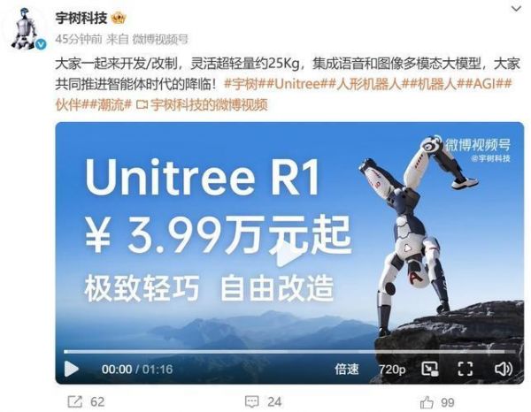 先看产品本身。宇树R1,25公斤,身高没说,但看视频里翻跟头的灵活劲儿,估计跟小学生差不多。卖点很明确:便宜、能打、可折腾。3.99万起,这个价格直接把同类产品按在地上摩擦——波士顿动力的Atlas不卖民用,特斯拉Optimus原型机还没量产,国内同类人形机器人动辄几十万起步,宇树这波直接把价格砍到“中产玩具”区间。