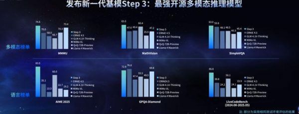 在智能方面,Step 3拥有强大的视觉感知和复杂推理能力,可准确完成跨领域的复杂知识理解、数学与视觉信息的交叉分析,以及日常生活中的各类视觉分析问题。Step 3在MMMU、MathVision、SimpleVQA、AIME25、LiveCodeBench(2024.08-2025.05)等榜单上取得了开源多模态推理模型的SOTA成绩。