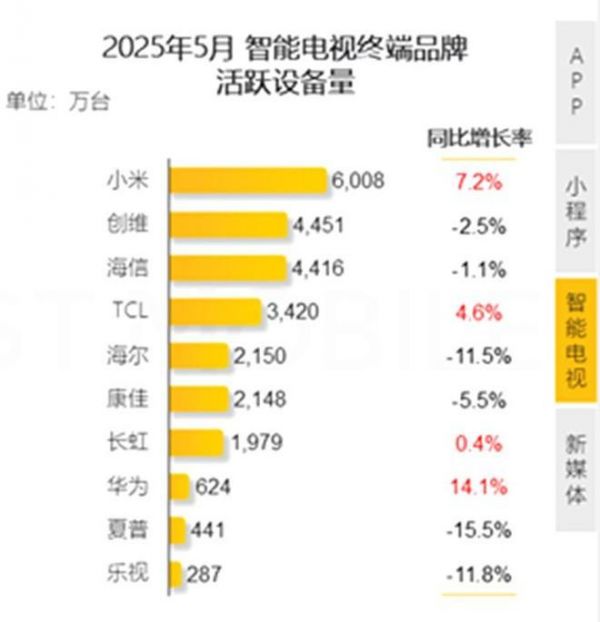 中国电视活跃量超2.8亿!小米、华为各斩获第一