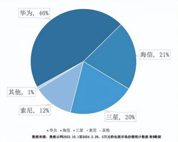 值得一提的是,华为电视在超高端市场表现相当卓越,奥维云维(AVC)曾统计过一份3万元档电视市场的份额图,其中,华为凭46%的市占率,将三星、索尼、海信等对手远远甩在身后;