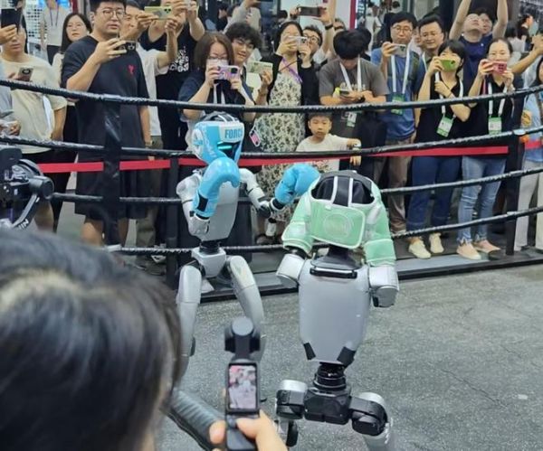 时代财经在7万㎡的展场不时看到人形机器人在穿梭和作业,不停引来观众的围观,有的更是直接“炸场”。一边,智平方的通用智能机器人AlphaBot(爱宝)伴随着摇滚乐打架子鼓,节奏带感;另一边,宇树科技的机器人摆起了擂台,两台UnitreeG1正在戴着头套和拳套激烈格斗,拳拳到肉,脚脚生风。