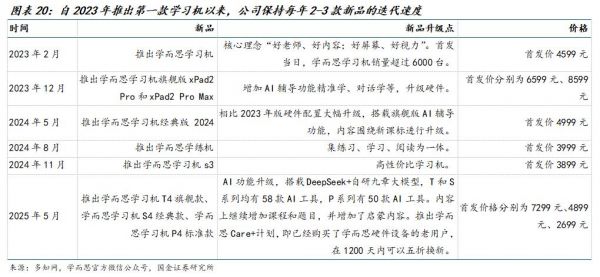2023年2月,学而思推出第一款学习机,之后每年以2-3款新品的速度迭代,从最开始的4500元-9000元高端机型,逐渐下探到2000元-3000元大众价位,并拓展至学练机品类。目前已经有8款SKU在售。
