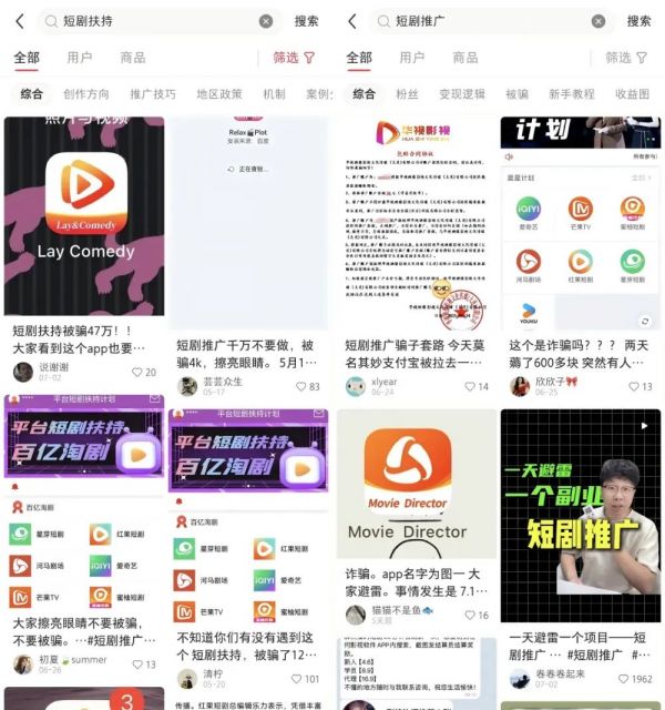 在小红书搜索“短剧扶持”、“短剧推广”会发现,有大量用户发帖曝光其被骗经历,多与李妍所遭受的骗局相似,且被骗时间大多集中在近几个月。