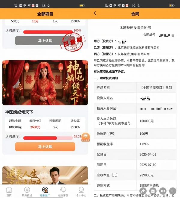 如澎湃新闻报道,一款名为“沐歌短剧”的APP利用微信公众号打广告吸引用户下载,宣称签到送现金、积分兑礼品,但下载软件后,APP立即弹出大量短剧投资项目,起购资金从几千到几万元不等。