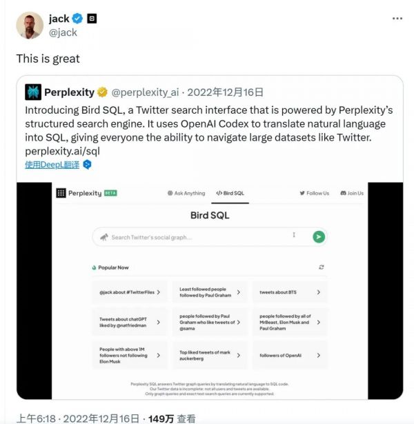 因此Bird SQL一经推出,Perplexity就迅速成为了硅谷最热的创业团队之一,就连推特当时的老板、创始人杰克·多西(Jack Dorsey)都忍不住当上了自来水,亲自转发了Perplexity的官推,称赞“This is great”。“全球首个对话式搜索引擎”Perplexity Ask也正是在这样的氛围里被迅速地开发出来,于2023年1月正式发布。