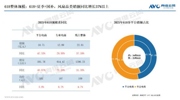 另据奥维云网数据,2025年618期间,电风扇销售额突破22.8亿元,同比增幅为37.59%;销量的同比增幅为31.38%,均价同比增长4.7%。